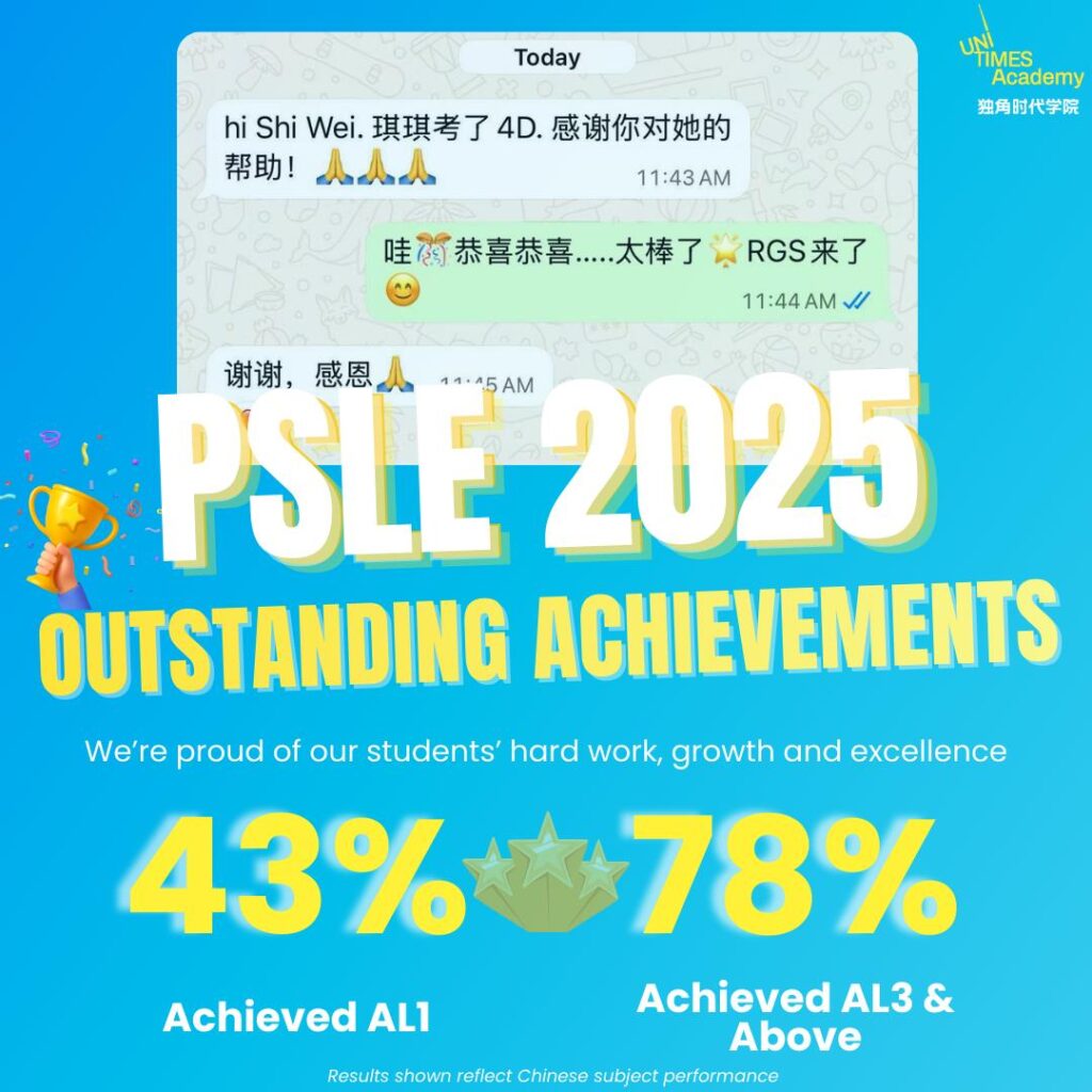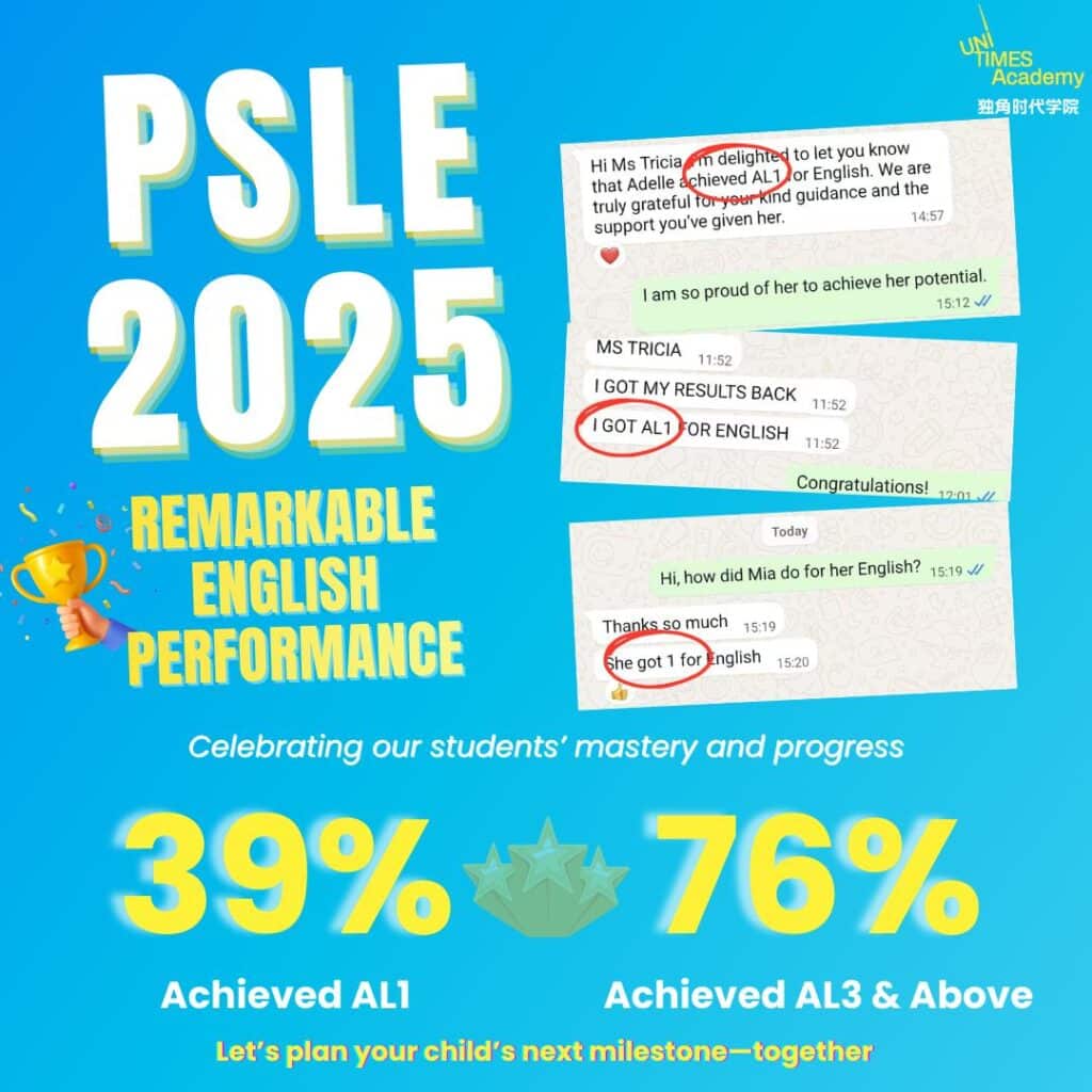 Unitimes Academy continues to produce strong PSLE outcomes backed by structured learning and proven strategies. Our 2025 results highlight how our students consistently excel, with many achieving top AL scores in both Chinese and English.